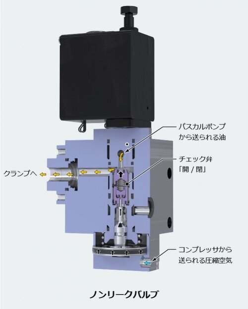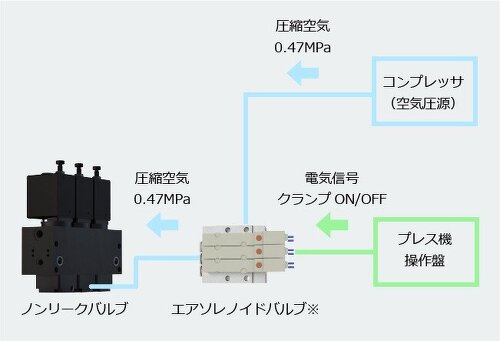 ポンプと同じく駆動源は「圧縮空気」。ポンプとの違いは、プレス機から「クランプON/OFF」の電気信号をうけ「圧縮空気」のON/OFFを切り替えを行っている点です。