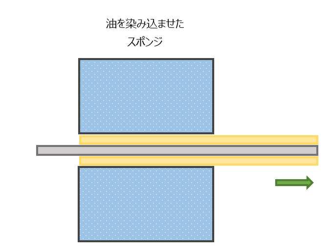 フェルト又はスポンジに油を染み込ませる事により、コイル材に油を塗油します。