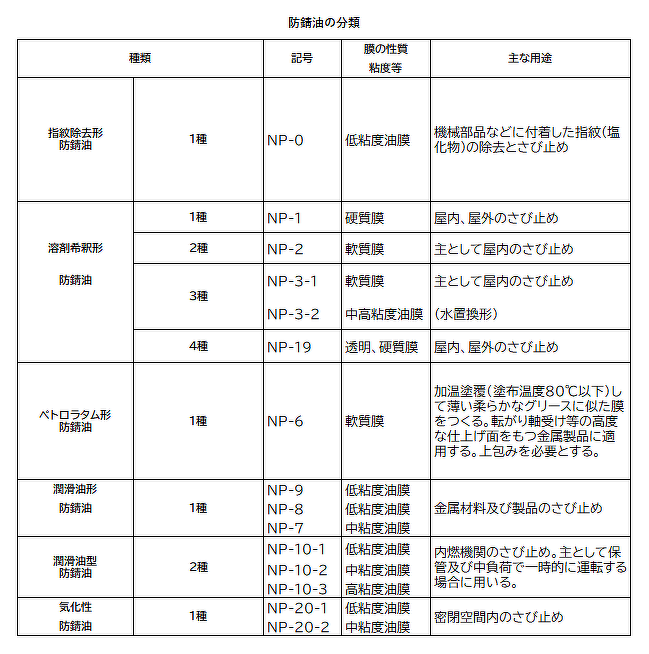 対象物別・防錆油の種類