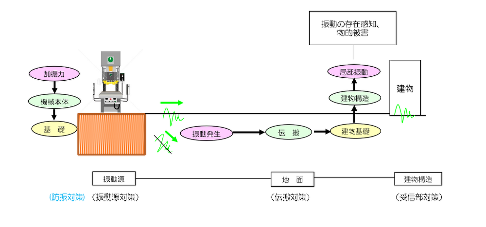“防振”とは、振動の伝達を低減させる対策のことを示しますが、その振動低減対策は次のようなものが挙げられます。