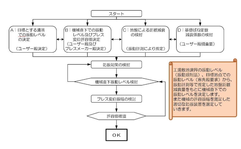 防振装置の仕様だけでは、発生する振動を最適な状態に制御できないため、ユーザー様が必要とする防振効果を決定された上で、プレスメーカー又は防振装置メーカーにご相談されると良いでしょう。特に振動問題等懸念される場合は、ユーザー、プレスメーカー及び防振装置メーカーの「3者の合意」をもって基礎仕様、プレス仕様、防振装置仕様を決定されることを推奨致します。