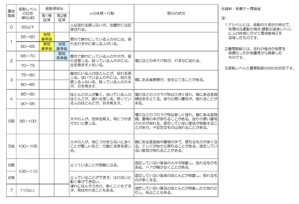 ご参考までに、振動レベル別に、人の体感にどのような影響が発生するかご紹介しましょう。