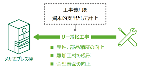 メカ式プレス機へサーボ化工事を実施した場合、スライドの速度やモーション設定が自由にできるようになり、生産性、 部品精度の向上、難加工材の成形、金型寿命の向上に大きな効果が期待できることから、工事費用を資本的支出として取り扱うことができます。