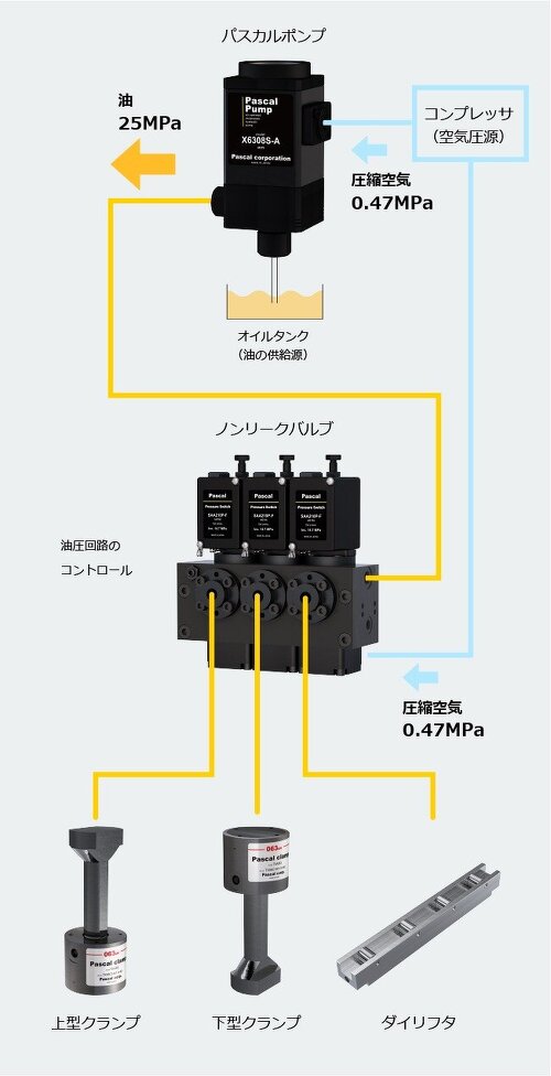 システムの動力源は、コンプレッサから送られた圧縮空気。この圧縮空気の圧力を25MPaの油圧力に変換することでクランプやダイリフタが作動します。