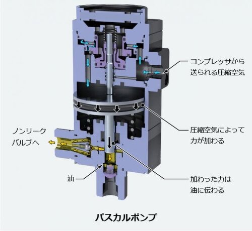 パスカルポンプ(以下ポンプ)の役割は、弱い圧縮空気の圧力を強い油圧力に変換することです。