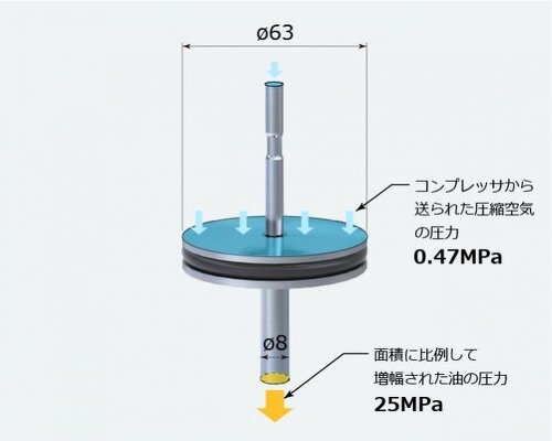 ポンプのピストン:ピストン上部のø63mmの面積に0.47MPaの力を加えると、ピストン下部のø8mmの面積に25MPaの力が発生する