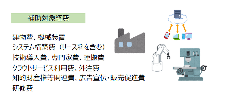 プレス機等の機械設備やシステム購入費はもちろん、建物の改修費、外注費等も補助対象となります。