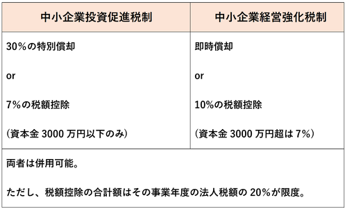 中小企業経営強化税制の税額控除は中小企業投資促進税制の税額控除と併用できます。 尚、各税制の税額控除の合計額は、その事業年度の法人税額の20%が限度となります。また、限度額を超過した分については、翌事業年度に繰り越せるとのことです。