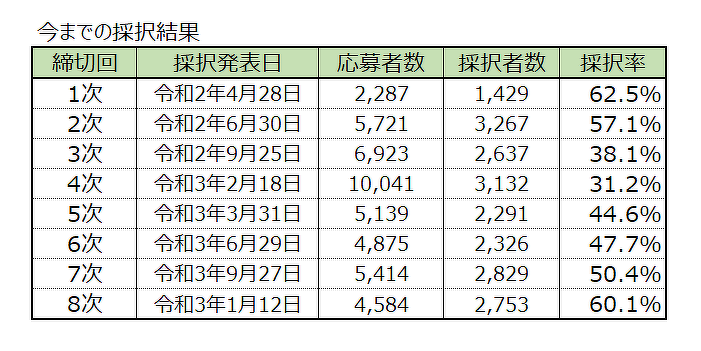 2~3カ月単位で締切が設けられており、直近のスケジュールとしては2022年5月11日(水)締切となります。