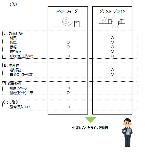 レベラーフィーダー、ダウンループラインのどちらを選定するかの判断項目として、以下の3つがあげられます。