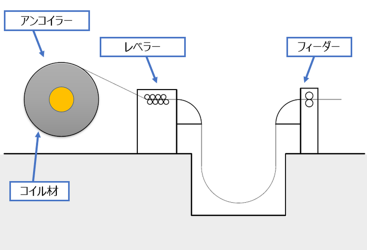 その名称の通り「レベラー部(=コイル材の巻き癖を除去し、平担にする役割)」と「フィーダー部(=プレスに一定の長さのコイル材を供給する役割)」が一体化したラインとなります。
