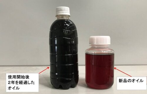 オイルは年数の経過とともに明らかに劣化がみられます。(写真は冷却油の比較)