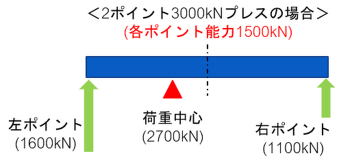 多工程成形の場合などで、荷重中心がプレス中心から離れると、2ポイントプレスの場合は荷重中心に近い方の