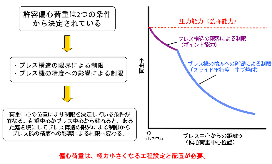ポイント能力による制限だけでは偏心荷重によるスライドの傾きが考慮されず、プレス機の精度の悪化や金型の破損、スライドガイドの焼付きなどが懸念されます。