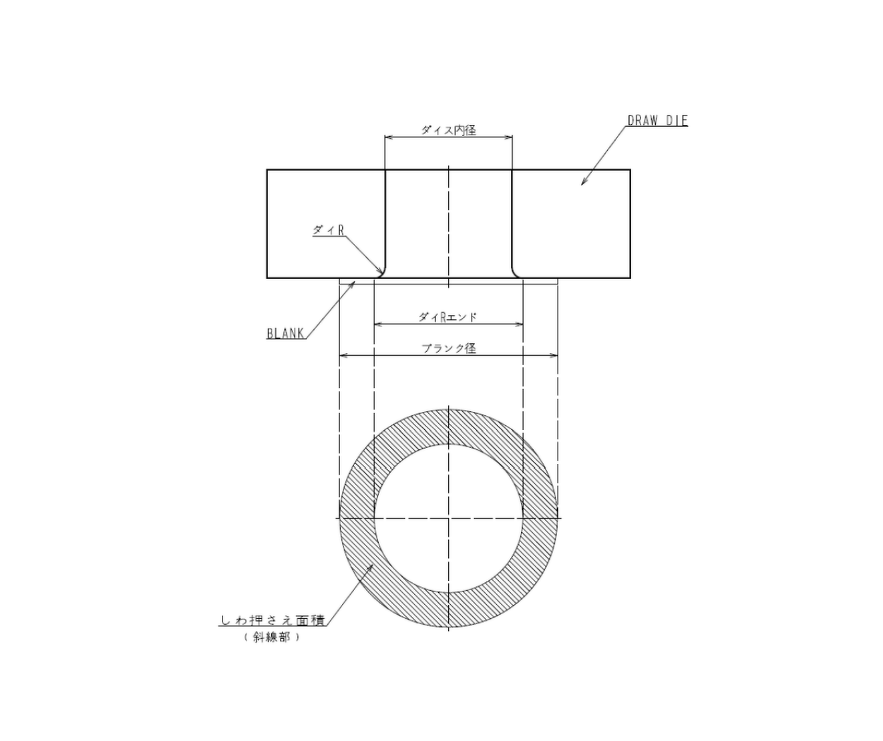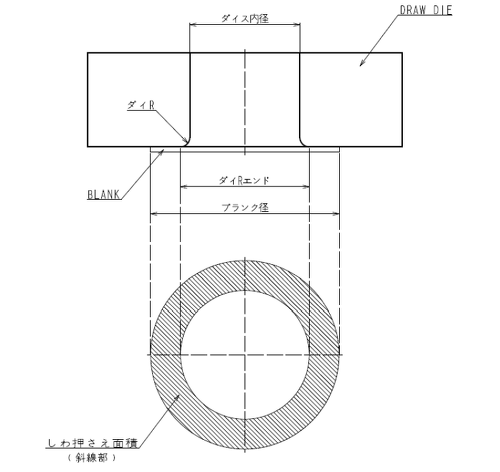 ※ブランクを押さえるしわ押さえ力の面積は、ブランク面積より絞りダイスのダイRエンドの径の面積をマイナスしたもの