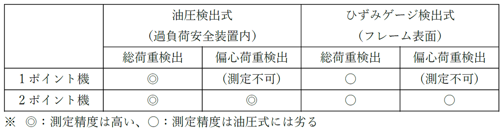 ③ 荷重の検出媒体がひずみゲージか、油圧変動による違い。