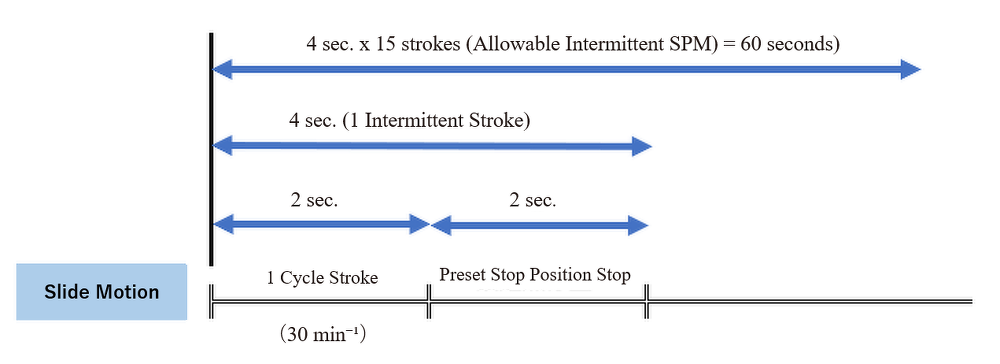 Intermittent operation is defined as a press operation where the press starts and moves the slide for one cycle before stopping at the preset stop position. Then, after a specific amount of time has elapsed, the press will repeat this one-cycle stroking-and-stopping sequence.