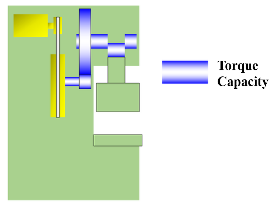 The structural areas related to torque capacity--the locations or components that transmit rotational force (the clutch, crankshaft, gears, etc.)--are shown in blue in the illustration below, and 'torque capacity' refers to the maximum torque value these can withstand.
