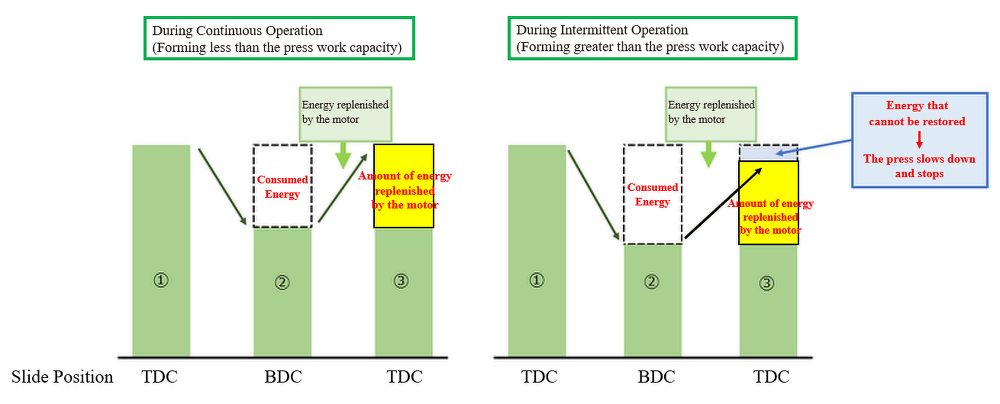 ② When forming starts and as the slide approaches bottom dead center, the stored energy is being consumed.