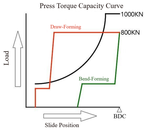 In the case of draw-forming, a 1000 kN press does not have sufficient capacity because the load would extend beyond the torque capacity curve. It will be necessary to use a higher-capacity press.