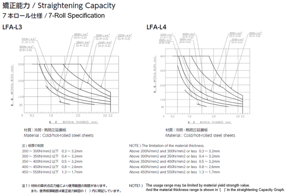 The following Straightening Capacity Diagrams show the achievable straightening ranges based on the thickness and width of materials that have a yield strength where plastic deformation will begin.