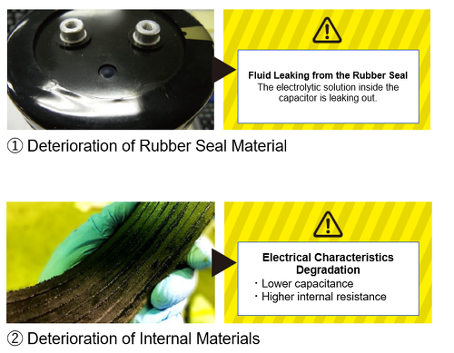Examples include possible changes in their electrical characteristics, such as the rubber seal material deteriorating and allowing the electrolytic solution inside the capacitor to leak out, or the deterioration of internal materials that results in lower capacitance and higher internal resistance.