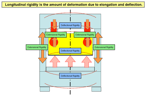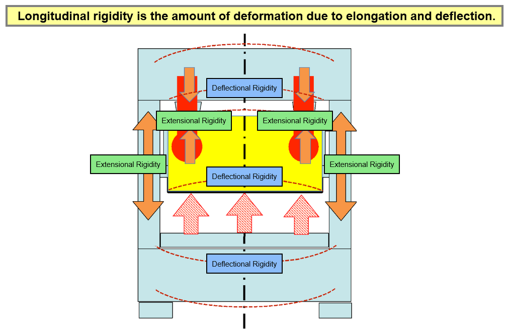 Longitudinal rigidity is the general term given to rigidity in the longitudinal (vertical) direction of the press, and it is primarily expressed as the amount of deformation due to "extensional rigidity" (the amount of press elongation) and "deflectional rigidity" (the amount of slide and bed deflection) when a forming load is applied on the press. As press longitudinal rigidity increases, the amount of deformation will decrease.