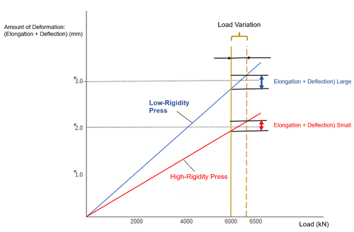 Assuming that the load variations are falling within the same ranges, a low-rigidity press (blue) will experience a large amount of deformation and a high-rigidity press (red) will experience a small amount of deformation.